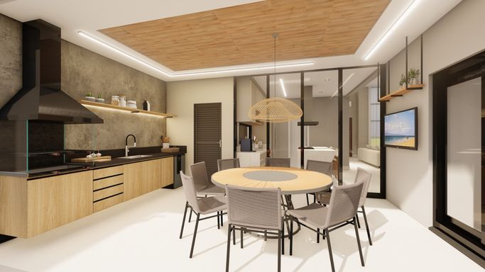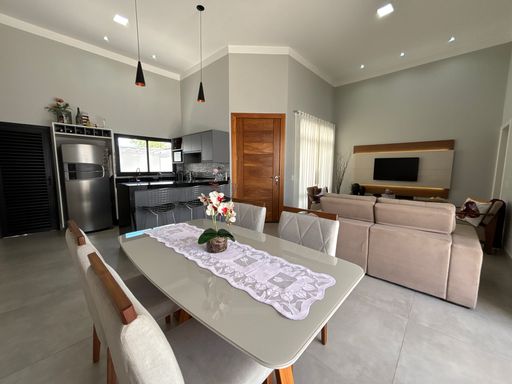 Área Total 200m² Área construída 134m² ✓03 dormitórios, sendo duas suítes , a master com closet com portas de vidro Reflecta Bronze ✓ Cozinha ampla com marcenaria ✓ área gourmet com churrasqueira com marcenaria ✓sala de estar e jantar integrados com espelho e painel com portas embutida ✓Roupeiro no corredor ✓Todos os ambientes preparados para ar condicionado ✓Boiler 400L já instalados ✓Móveis planejados de alto padrão em todos os ambientes ✓Garagem para 3 carros sendo uma coberta