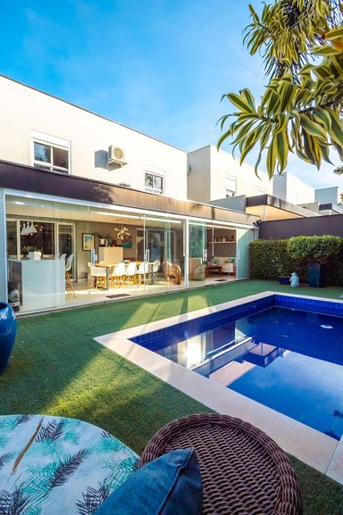 Lindo Sobrado de Esquina com 5 Suítes com escritório e Espaço Gourmet Completo! Este sobrado encantador une conforto, elegância e funcionalidade em cada detalhe. ✨ Destaques do Imóvel: 4 Suítes, sendo 1 no andar térreo, todas com móveis planejados nos quartos e banheiros. Suíte master com amplo closet e excelente iluminação natural. Escritório com sacada no piso superior , perfeito para home office. 🏠 Piso Térreo: Hall de entrada imponente e lavabo decorado. Sala de estar com papel de parede, espelho decorativo e móvel bar. Sala de jantar integrada à cozinha ampla, com copa, coifa, forno a gás e cooktop. Bancadas em granito e armários planejados brancos, que trazem sofisticação e praticidade. Lavanderia com móveis sob medida. 🍖 Área Gourmet e Lazer: Varanda Gourmet completa, com ilha central , churrasqueira, ambientes de estar e jantar integrados. Fechamento em portas de correr com persianas Tela Solar, proporcionando conforto e luminosidade controlada. Piscina e jardim paisagístico prontos, com vasos e plantas ornamentais. Banheiro de apoio na área externa. Um imóvel ideal para quem busca conforto, modernidade e excelente localização!