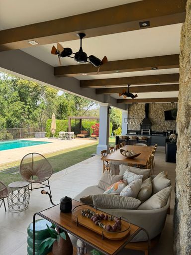 Características: - Mais de 500m2 construídos em terreno com vista para a mata. - Arquitetura toscana contemporânea, assinada por Fernanda Santoro. - 5 suítes, incluindo master com closet e banheira de hidromassagem para 2. - Sala imponente com pé-direito de 5m e lareira em mármore travertino. - Varanda gourmet completa com ilha refrigerada e churrasqueiras premium. - Piscina integrada ao jardim com paisagismo autoral. - Marcenaria em madeira natural, móveis assinados e eletrodomésticos de alto padrão. - Portas em madeira e janelas em aço corten. - Aquecimento solar, preparação para cisterna de 10.000L. - Garagem coberta para 4 carros. - Localização privilegiada: rua nobre, a 5 minutos a pé do clube. - Construção 2018 — pronta para morar.