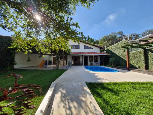 Características: -447m² de terreno -264m² de construção No térreo: -Sala dois ambientes integrada a sala de jantar -Pé direito alto com teto em madeira -Cozinha reservada -Despensa -Lavanderia espaçosa -2 suítes, sendo uma com closet -Corredor lateral em ambos os lados -5 vagas de garagem, sendo 4 cobertas -Piscina aquecida -Pergolado no jardim de entrada -Pergolado para orquidário com sombrite no quintal dos fundos -Jardim com grama No piso superior: -Mezanino (que pode ser utilizado como escritório) -2 suítes, sendo uma com varanda -Bastante luz natural O imóvel possui: -4 suítes ao todo, sendo duas no térreo -Aquecimento solar (Boiler) -Alarme, câmera de segurança e cerca elétrica -Planejados na cozinha e banheiros -Ar condicionado na suíte master e em um dormitório -Ventilador de teto -Casa com cara de chácara -Excelente localização e rua sem saída