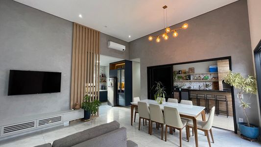 Casa Térrea em Indaiatuba, Condomínio Laguna Área do terreno: 300 m² Área construída: 188,57 m² Destaques do Imóvel: Sala de estar: Porta social em alumínio com fechadura eletrônica, painel de TV até o teto com iluminação em LED Sala de jantar Cozinha planejada: Iluminação em LED, micro-ondas, forno elétrico, lava-louças (8 serviços), cuba inox, torneira monocomando, dispenser de detergente, ilha em granito, cooktop 5 bocas, coifa ilha em inox Área gourmet: Móveis planejados, churrasqueira, coifa, painel de TV Ar-condicionado (30.000 BTUs) instalado nas áreas: sala, sala de jantar, cozinha e área gourmet Lavanderia: Tanque inox, bancada em granito, armários planejados e despensa integrada Escritório: Planejados com iluminação em LED e ar-condicionado (9.000 BTUs) Lavabo: Cuba em granito preto, prateleira planejada, ducha higiênica e tampa no vaso Suítes: Suíte 1: Veneziana automatizada blackout, ar-condicionado (9.000 BTUs), banheiro com armários planejados, cuba esculpida em granito, ducha higiênica, box e água quente Suíte 2: Mesma configuração da suíte 1 Suíte Master 3: Veneziana automatizada blackout, ar-condicionado (12.000 BTUs), banheiro completo com planejados, cuba esculpida em granito, ducha higiênica, box, duas duchas e água quente Complementos: Corredor com armário planejado Piscina com cascata, hidro e iluminação Sistema de aquecimento solar com boiler de 500 litros e pressurizadores Internet via cabo instalada no escritório, sala, área gourmet e nas três suítes O condomínio possui área de lazer completa com churrasqueira, piscina, quadra poliesportiva, academia, lago para pesca, espaço pet, área de descanso e salão de festas. Portaria e segurança 24 horas.