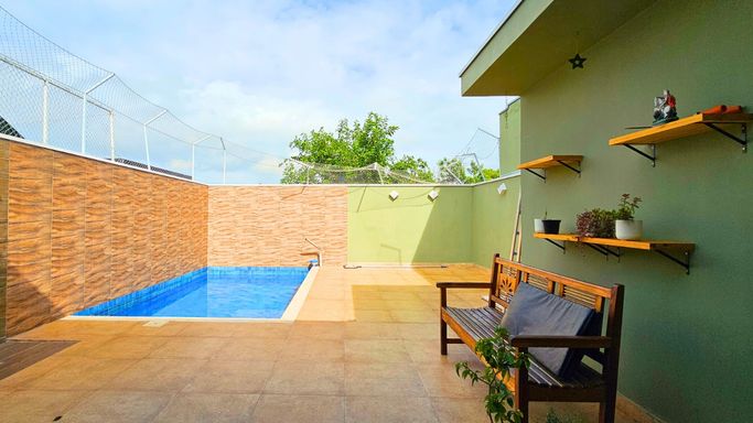 Características: -Área do Terreno 284 m² -Área construída 192 m² - 3 quartos, sendo a master com closet. - Banheiro social. - Lavabo. - Sala ampla em conceito aberto e com pé direito duplo. - Cozinha e área gourmet integradas. - Despensa. - Área gourmet com churrasqueira e sistema de som bluetooth embutido. - Piscina. - Banheiro externo. - Esquadrias golden com persiana motorizadas. - Móveis planejados no banheiro da suíte, closet, banheiro social, cozinha, área gourmet. - Aquecimento solar instalado e funcionando, com duchas nos banheiros e torneiras aquecidas na cozinha e banheiros. - Preparação para ar condicionado. Condomínio: -Academia -Espaço pet -Playground -Brinquedoteca -Churrasqueira -Piscina -Quadra poliesportiva -Campo de futebol -Salão de festas -Portaria e segurança 24 horas Estuda permuta!