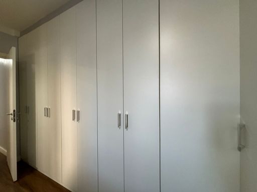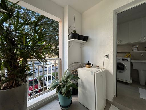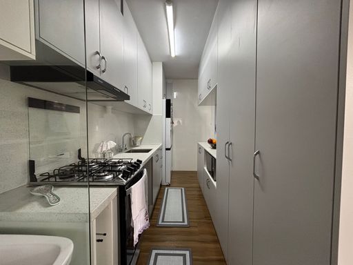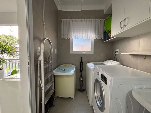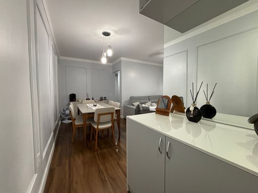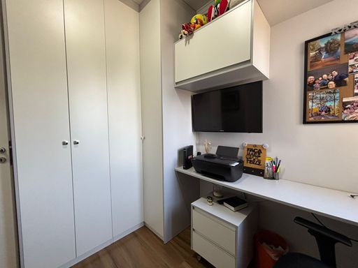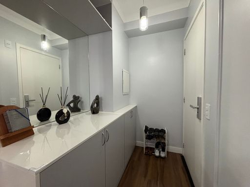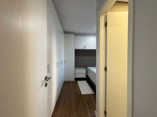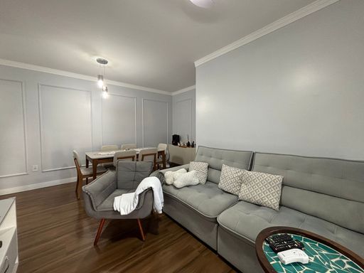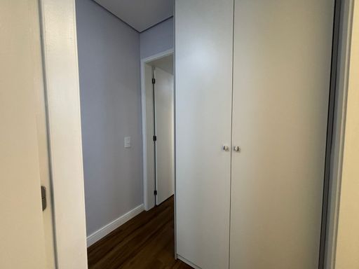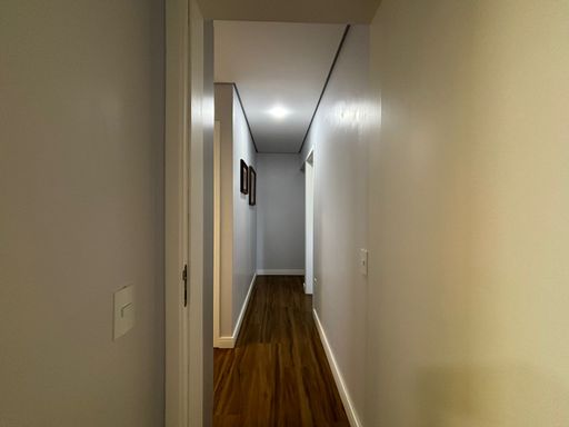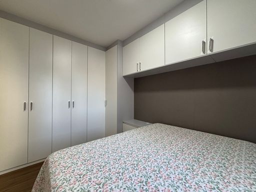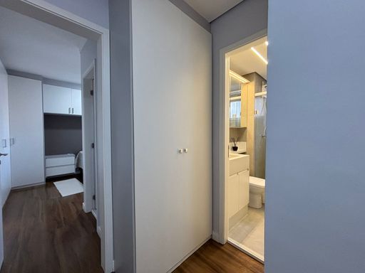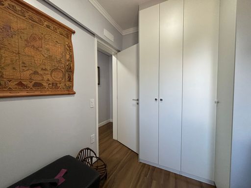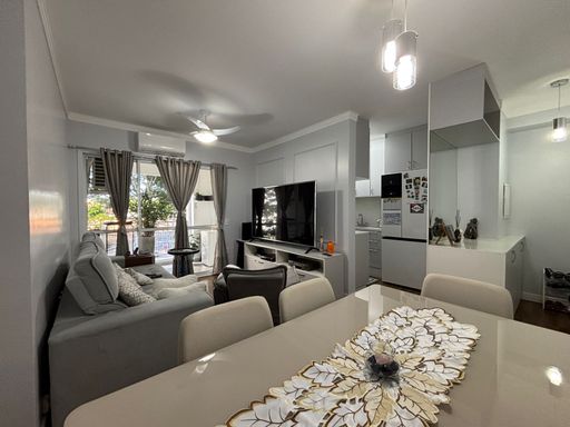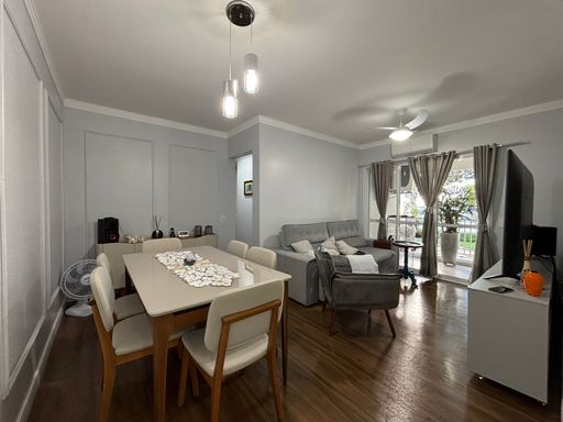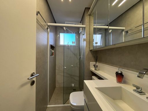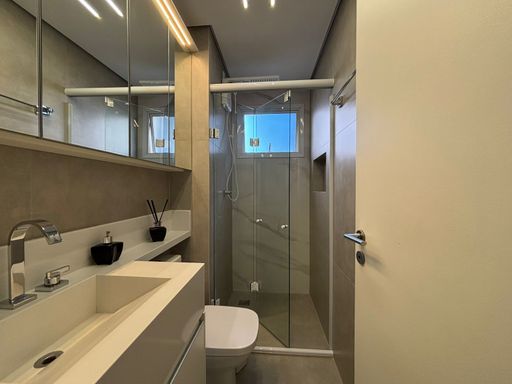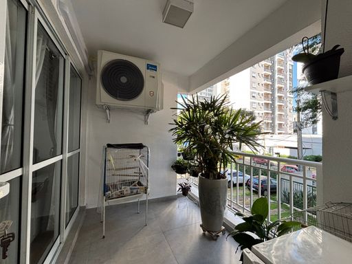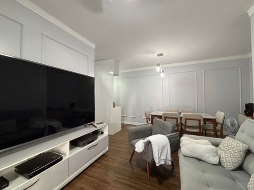 - Sala em 2 ambientes com piso de porcelanato, ventilador de teto, ar condicionado, persianas, espelho e painel de parede;