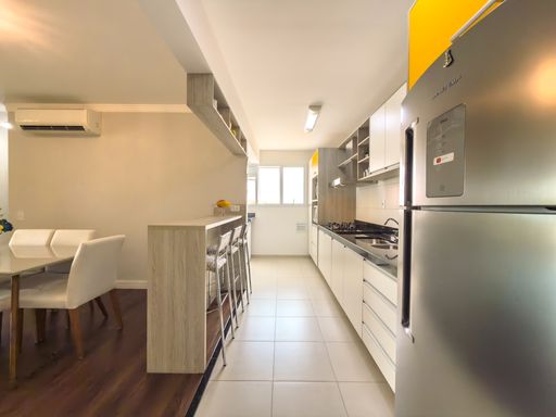 - Cozinha planejada e equipada com cooktop, coifa, forno e micro-ondas;