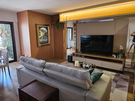 - Sala de estar com sofá, painel com tv e adega de vinhos;