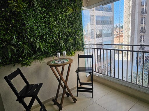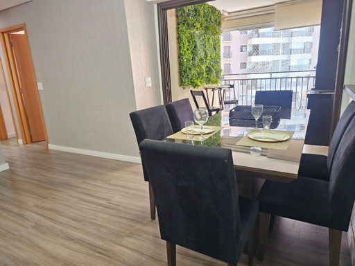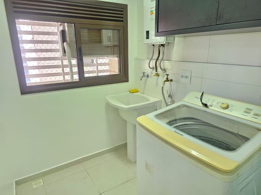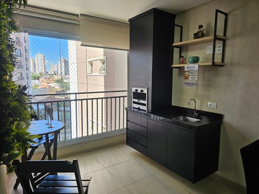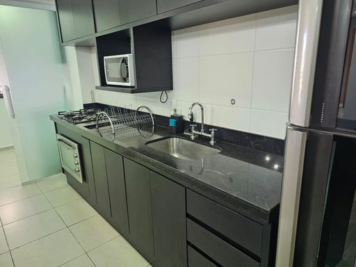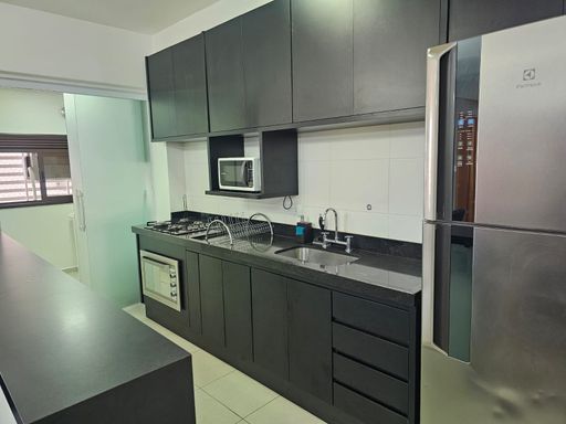 - Cozinha planejada, com geladeira, cooktop, forno e microondas;