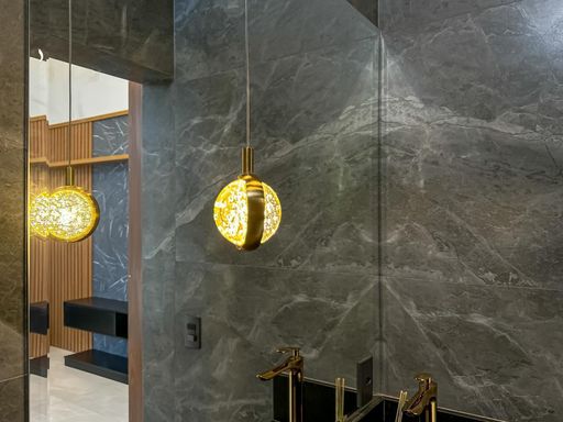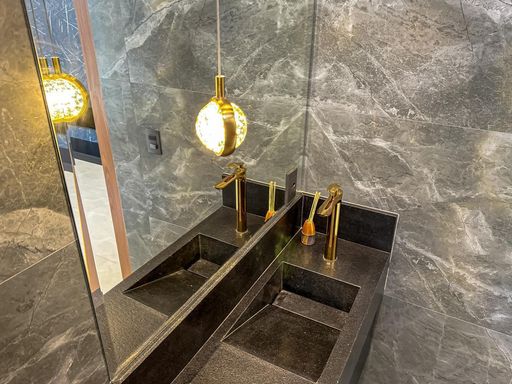 Lavabo com móvel planejado, pia esculpida em pedra São Gabriel escovada, vaso preto, espelho,
