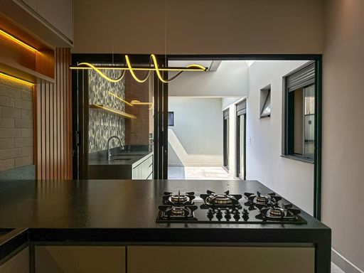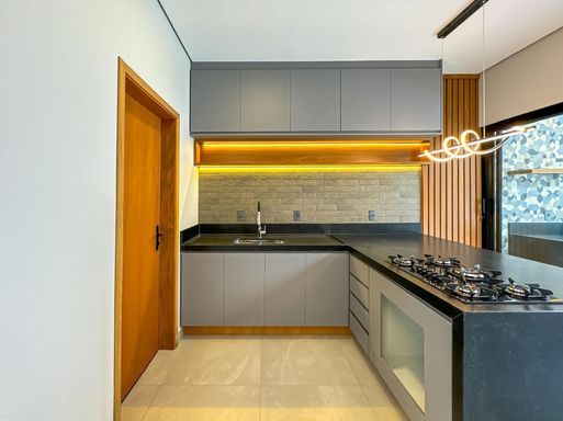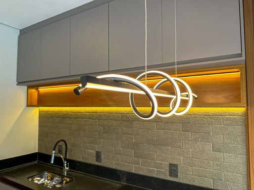 planejados, teto em gesso rebaixado, iluminações em led, lustre, e cooktop