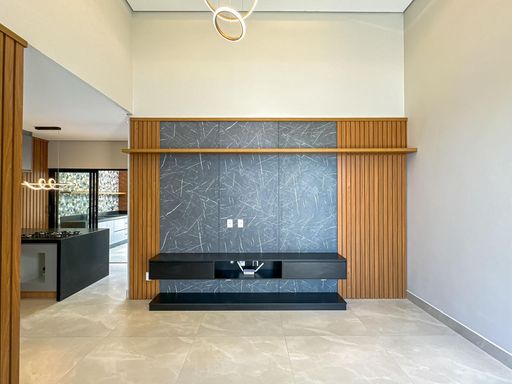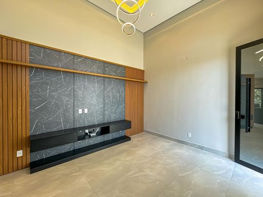 Sala com pé direito alto (4,50MTS) composta por móveis planejados, teto em gesso rebaixado com