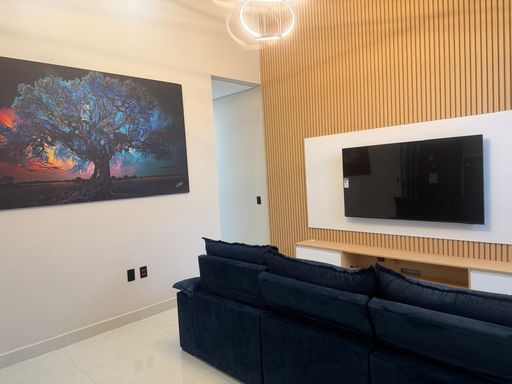 - Sala elegante com painel, rack e TV de 65, Sofá incluso