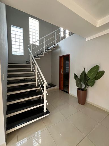 - Escada de mármore preto, guarda corpo e corrimão de alumínio branco.