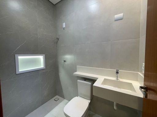 Banheiros com nicho, iluminação em Led e pias em mármore/stone