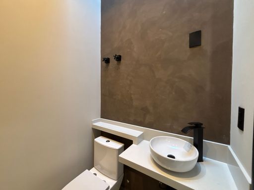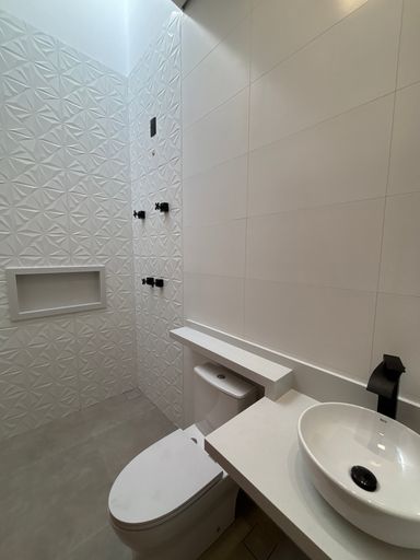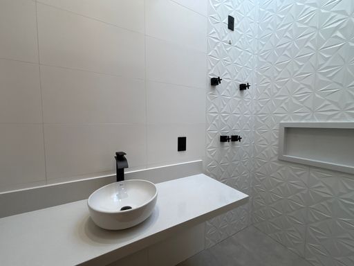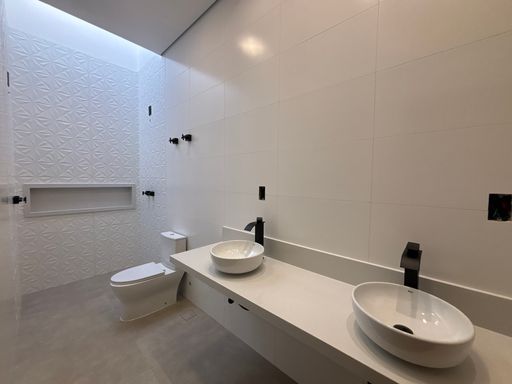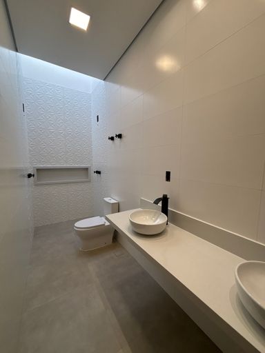 - banheiros e lavabo com bancada branco prime e louça cerâmica.