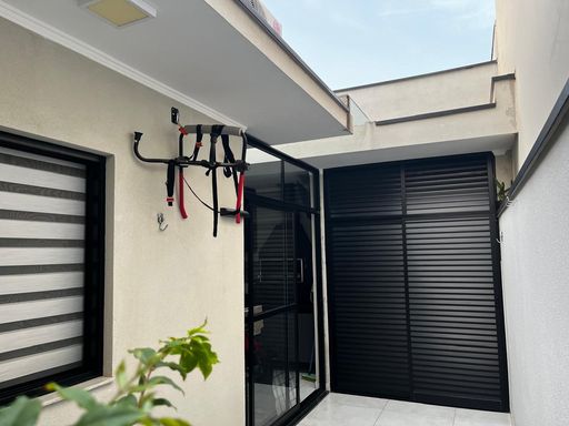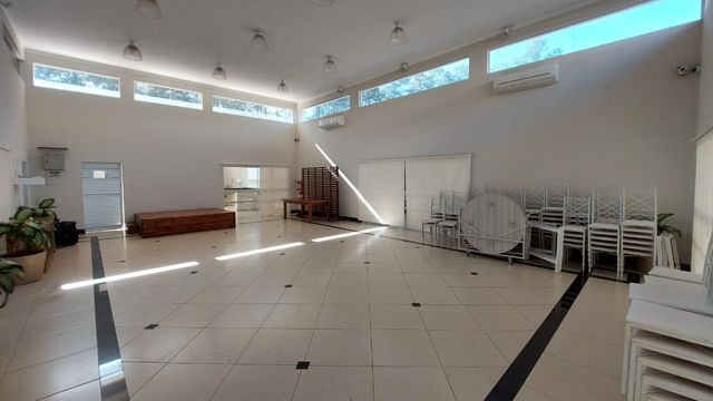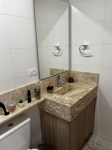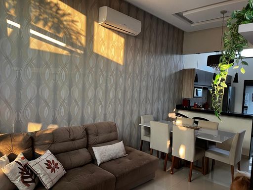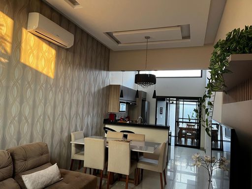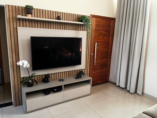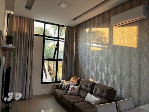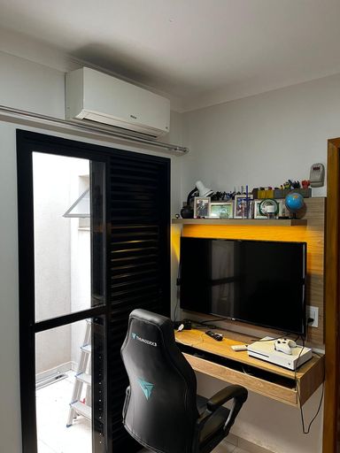 -Sala com pé-direito alto, rack planejado e ar-condicionado