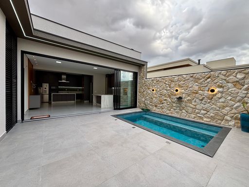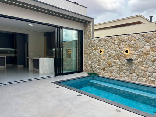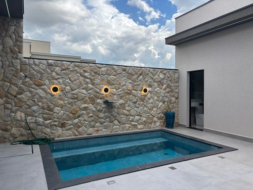 - Piscina aquecida com iluminação e pedra moledo de decoração;