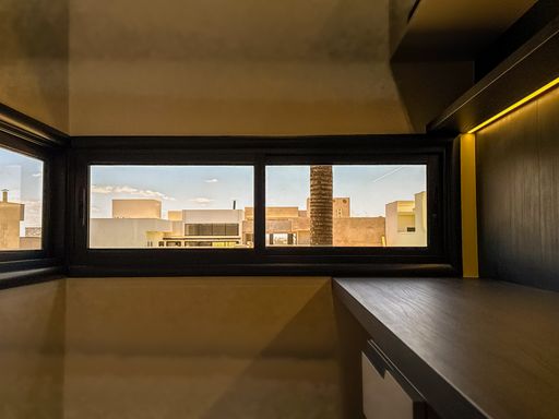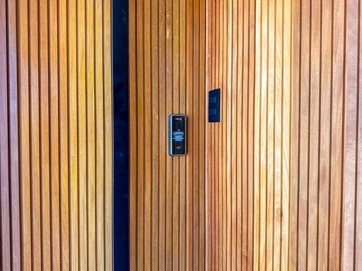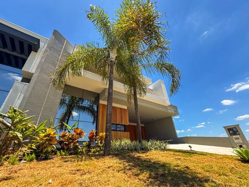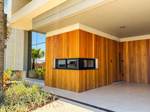 - Fachada com revestimentos, detalhes em madeira e janela em pele de vidro;