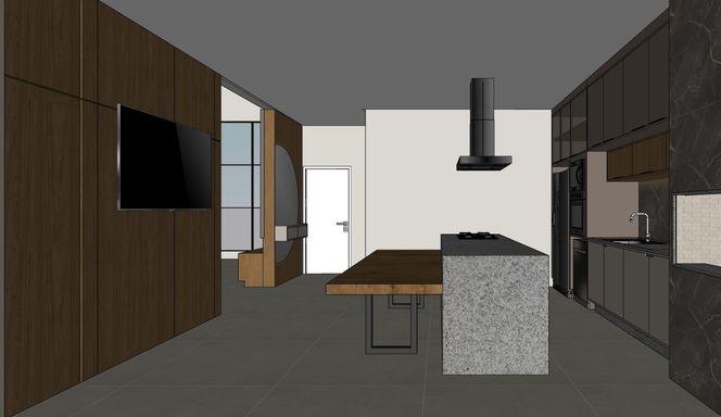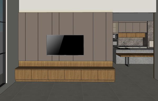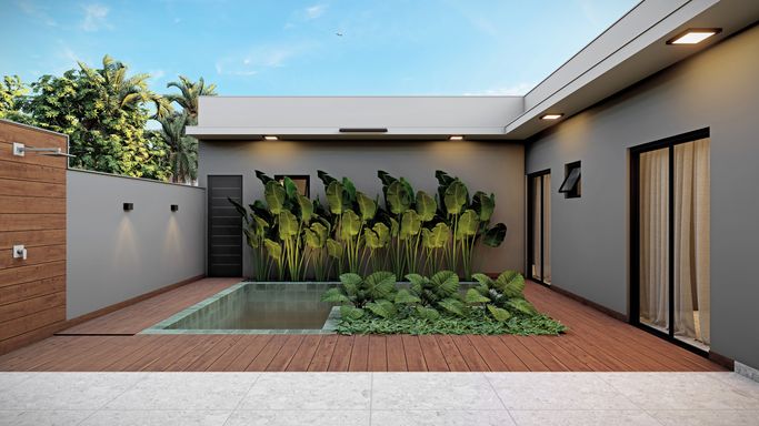 - Fachada com revestimentos, detalhes em madeira e janela em pele de vidro;
