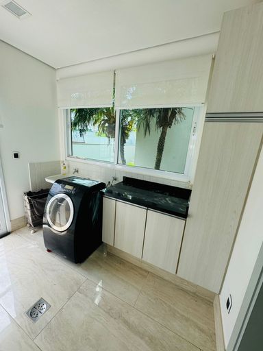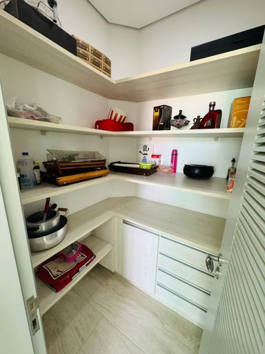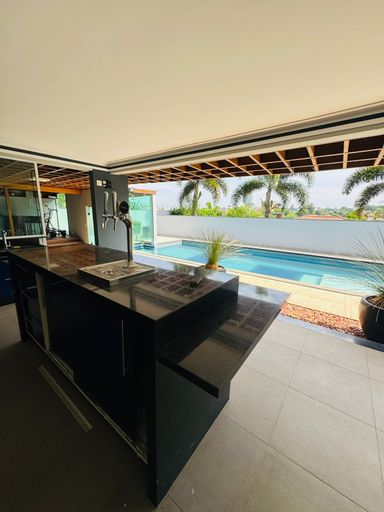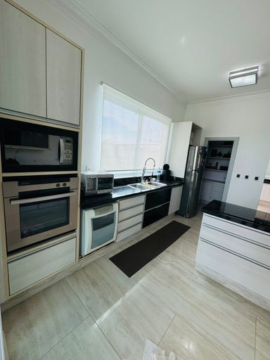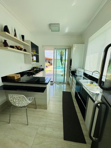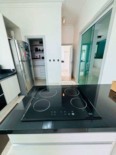 - Cozinha planejada coocktop de indução, forno, microondas, máquina de lava louça e geladeira com vista para a piscina;