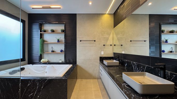 -Suíte master com closet amplo, hidromassagem e bancada em mármore Nero Marquina