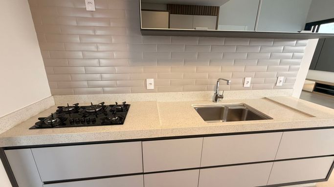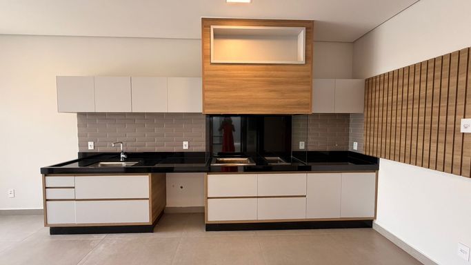 - Cozinha & Gourmet: Cozinha planejada integrada à área gourmet, que conta com churrasqueira a carvão e chapeira instalada.