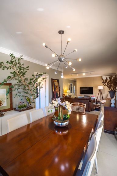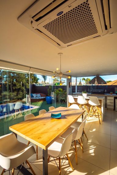 Sala de jantar integrada à cozinha ampla, com copa, coifa, forno a gás e cooktop.