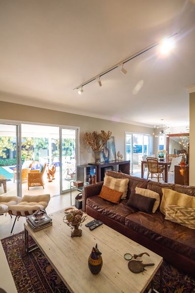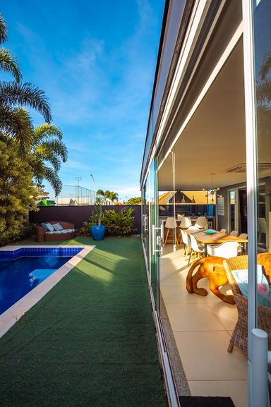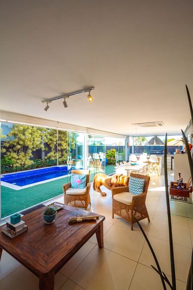 Fechamento em portas de correr com persianas Tela Solar, proporcionando conforto e luminosidade controlada.