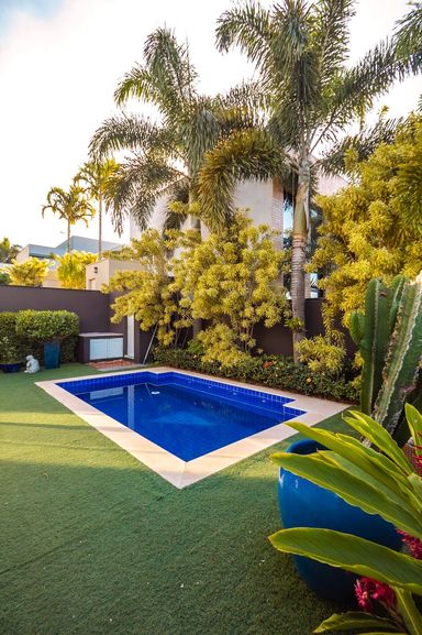 Piscina e jardim paisagístico prontos, com vasos e plantas ornamentais.