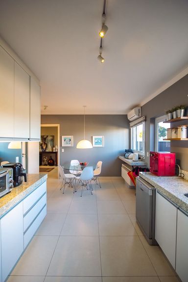 Bancadas em granito e armários planejados brancos, que trazem sofisticação e praticidade.
