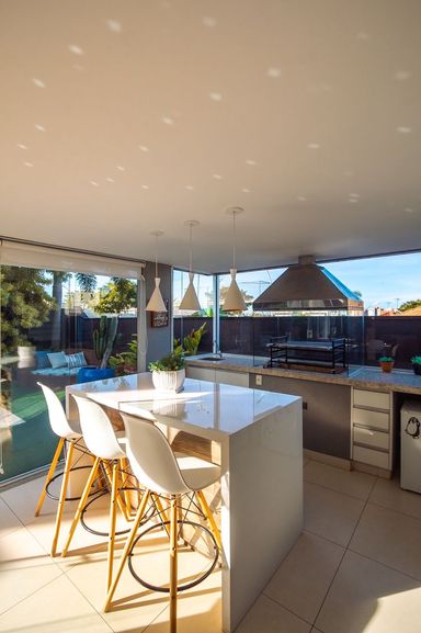 Varanda Gourmet completa, com ilha central , churrasqueira, ambientes de estar e jantar integrados.