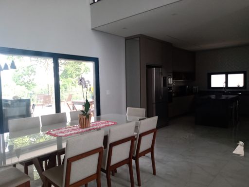 Ampla sala com pé direito duplo integrada com sala de jantar e cozinha com ilha.