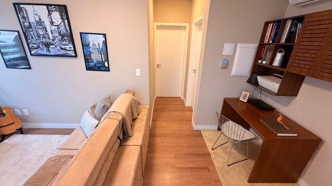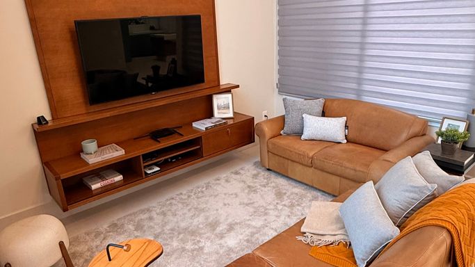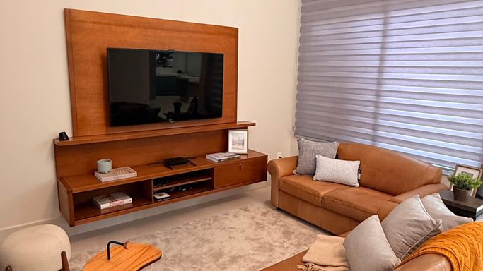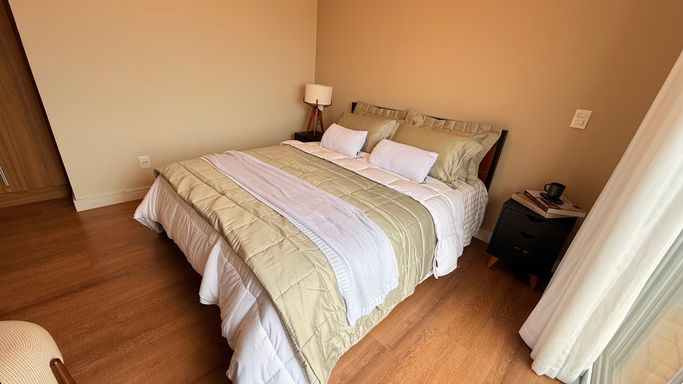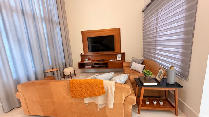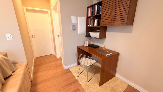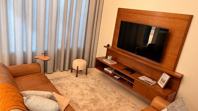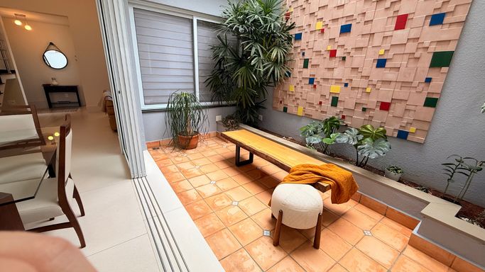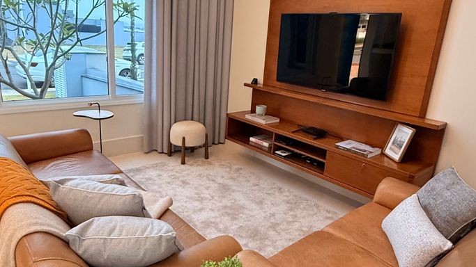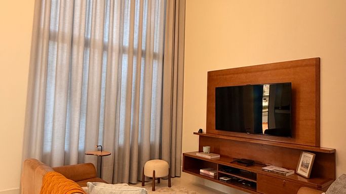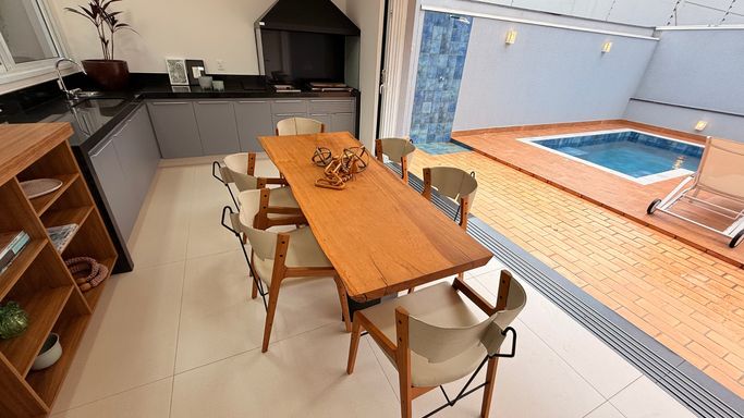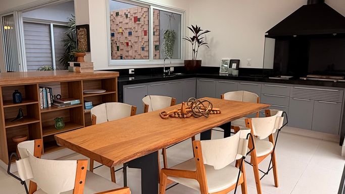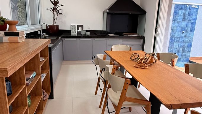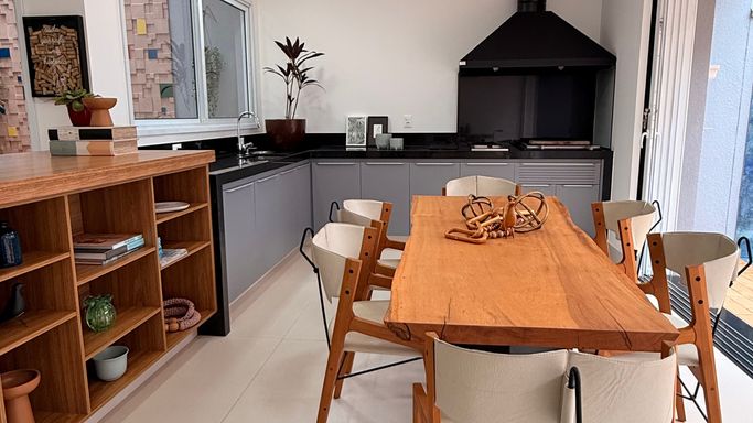 Cozinha com móveis planejados, cooktop, forno e microondas