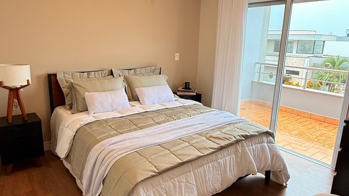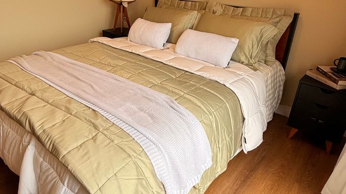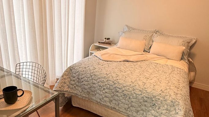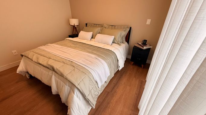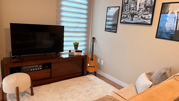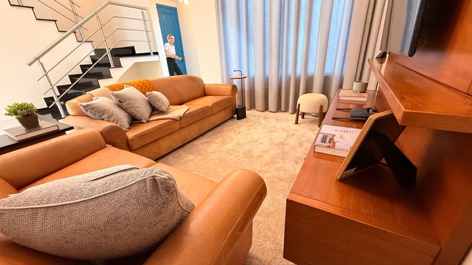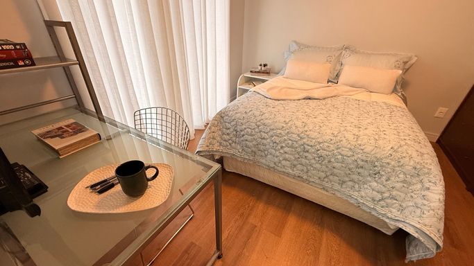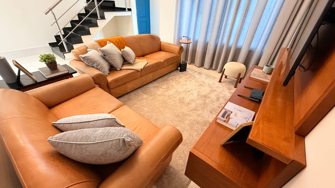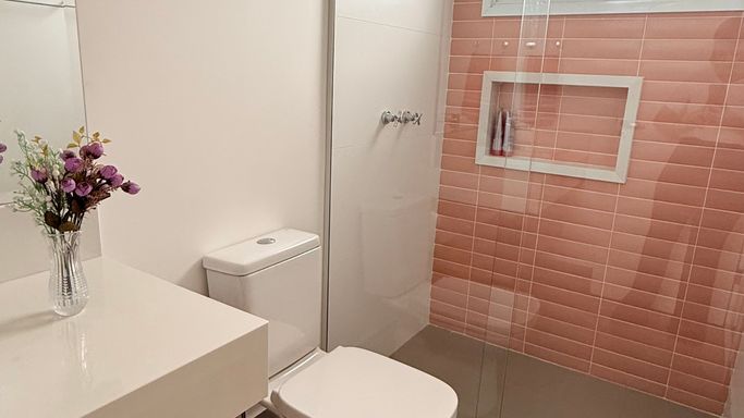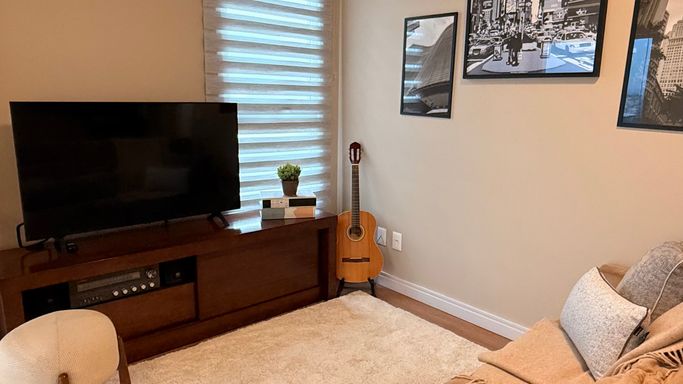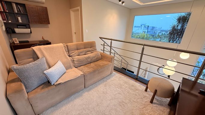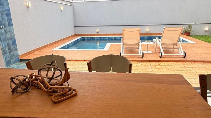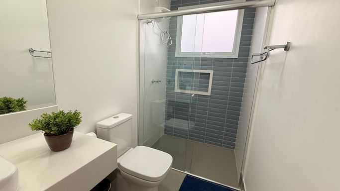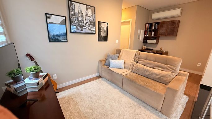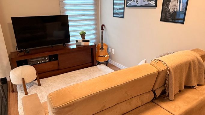 Cozinha com móveis planejados, cooktop, forno e microondas
