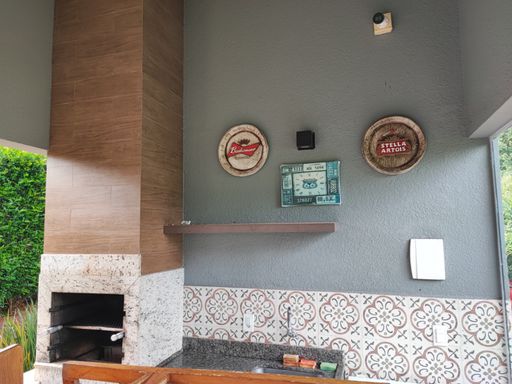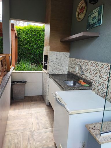 Andar Inferior: Sala para 2 ambientes, cozinha com cooktop pronta para máquina de lavar louças, lavabo, lavanderia, área gourmet com churrasqueira, área externa nos fundos e na lateral, garagem para 4 vagas sendo 2 cobertas.