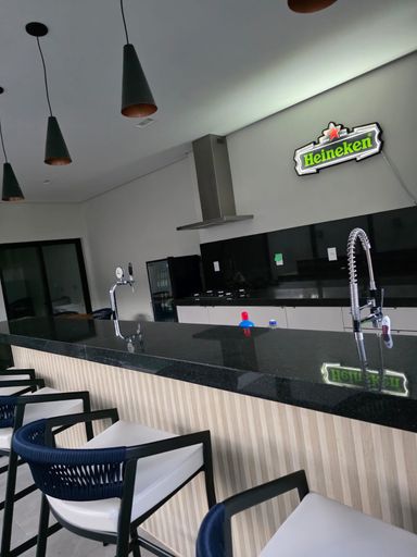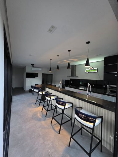 A área gourmet é completa e integrada, com churrasqueira, cooktop, mesa para oito lugares, chopeira Shefer, cervejeira e retroprojetor.