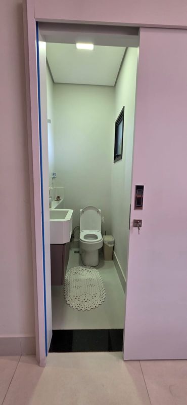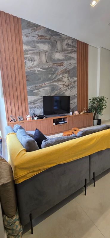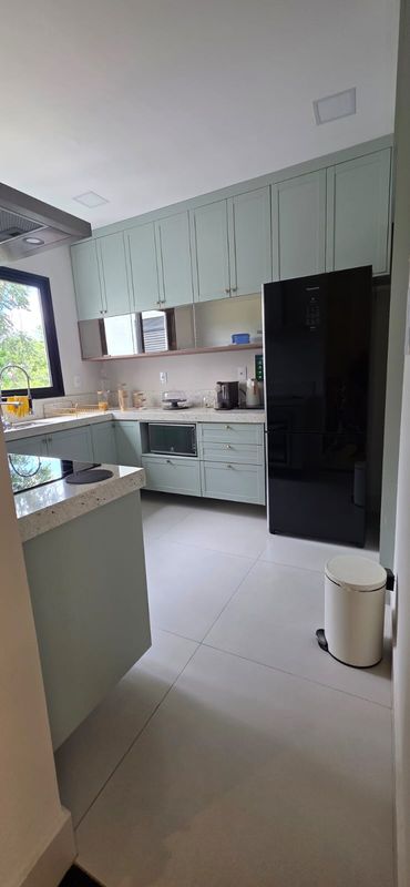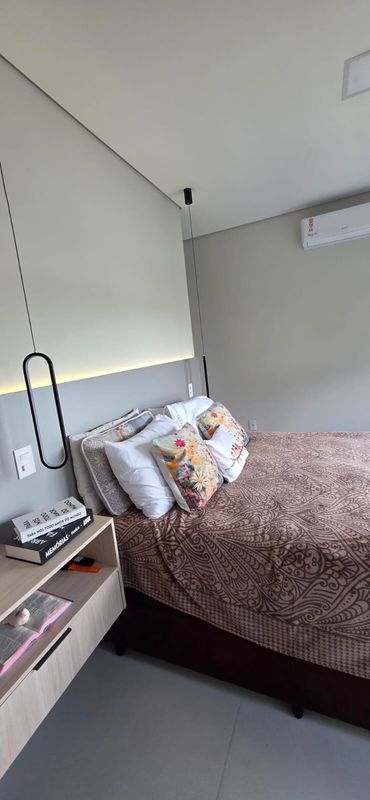 A área social oferece sala de estar mobiliada, integrada à cozinha planejada, equipada com cooktop, forno, coifa, micro-ondas e despensa. Um lavabo atende o pavimento com funcionalidade.