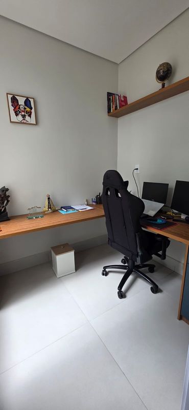 No pavimento inferior, o imóvel conta com escritório envidraçado e climatizado, com móveis sob medida e vista para a piscina.
