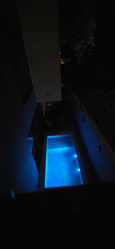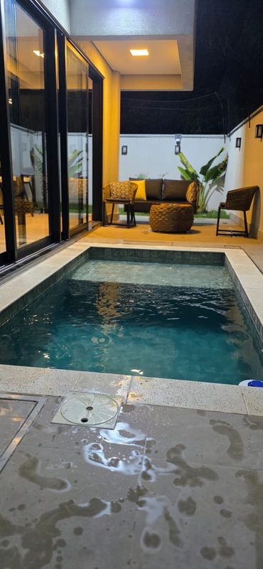 A área externa dispõe de piscina com prainha, hidromassagem e iluminação, além de lavanderia fechada, depósito e jardim nos fundos.