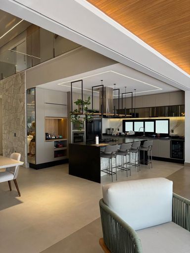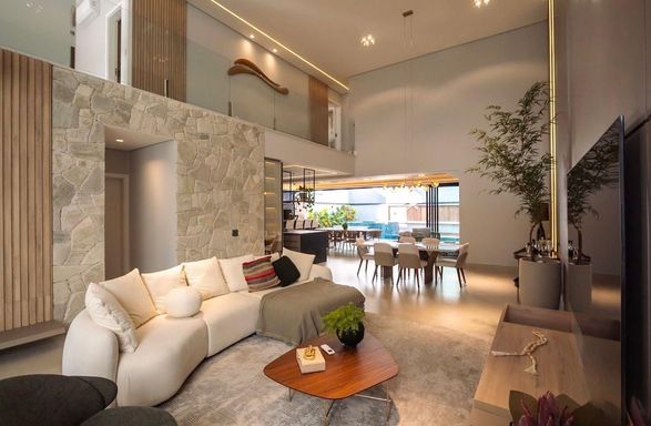 -Sala de estar com pé-direito duplo integrada à sala de jantar, cozinha e área gourmet